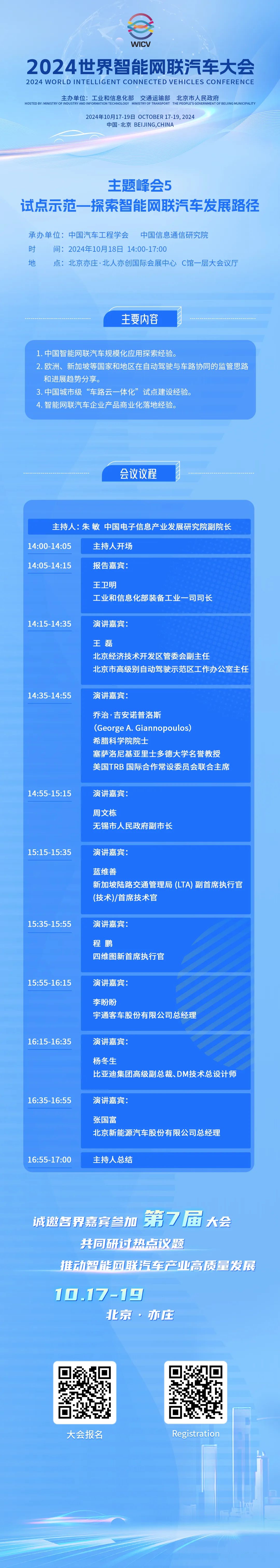世界智能网联汽车大会(英文简称WICV)是我国首个经国务院批准的国家级智能网联汽车专业会议,自2018年起,已连续成功举办六届。2024世界智能网联汽车大会由工业和信息化部、交通运输部、北京市人民政府共同主办,将于10月17-19日在北京召开。