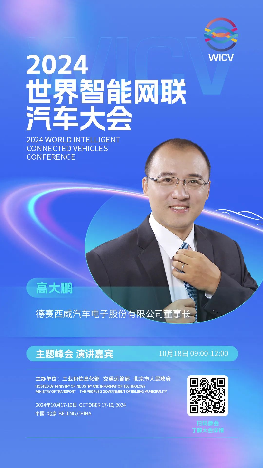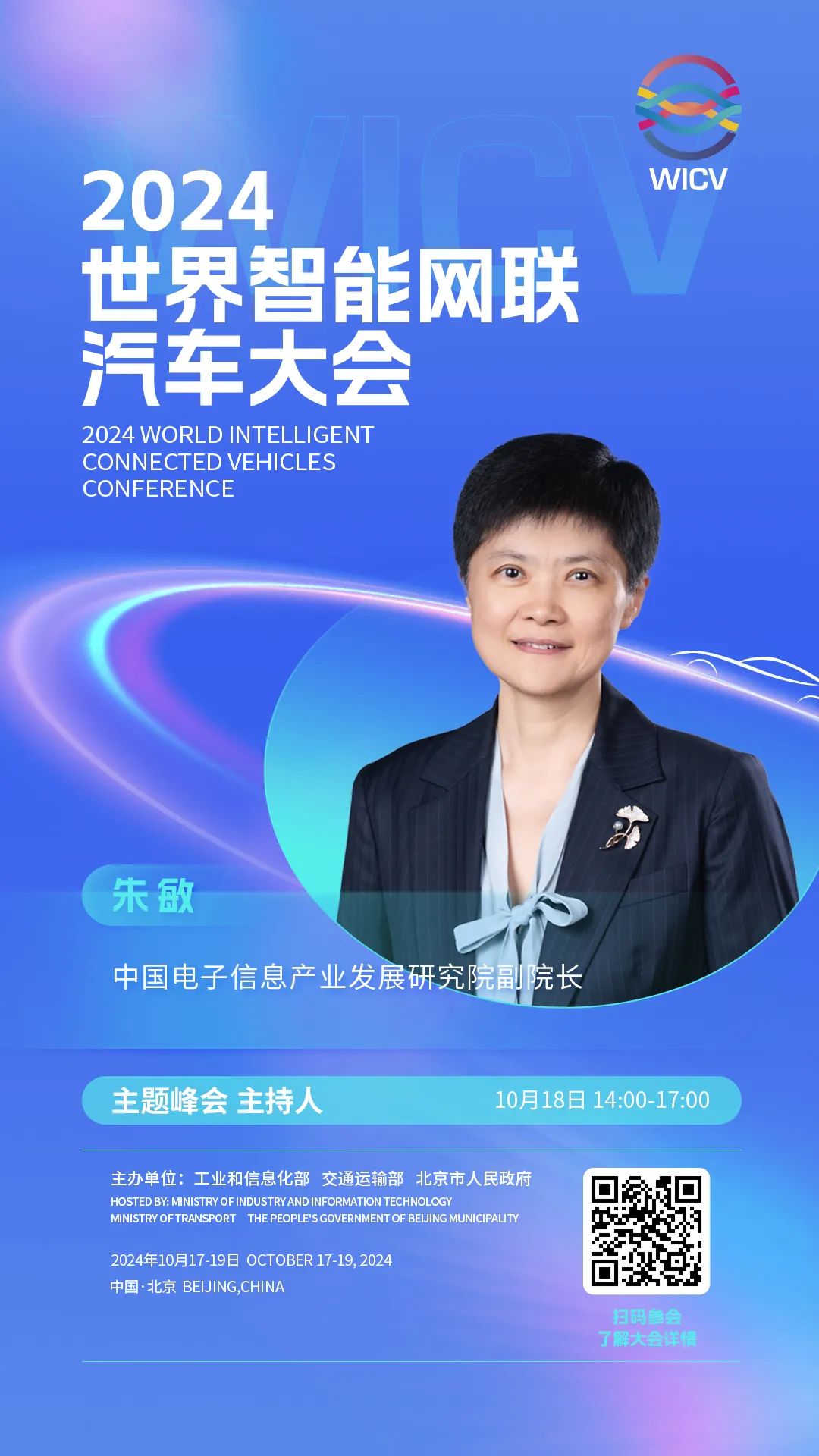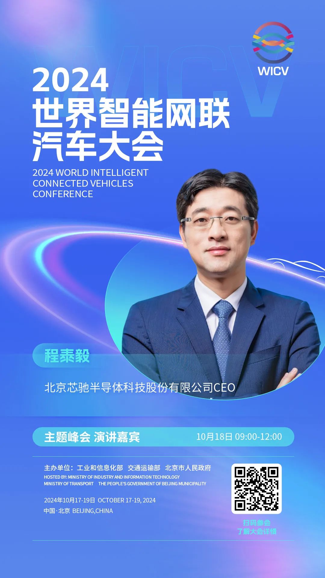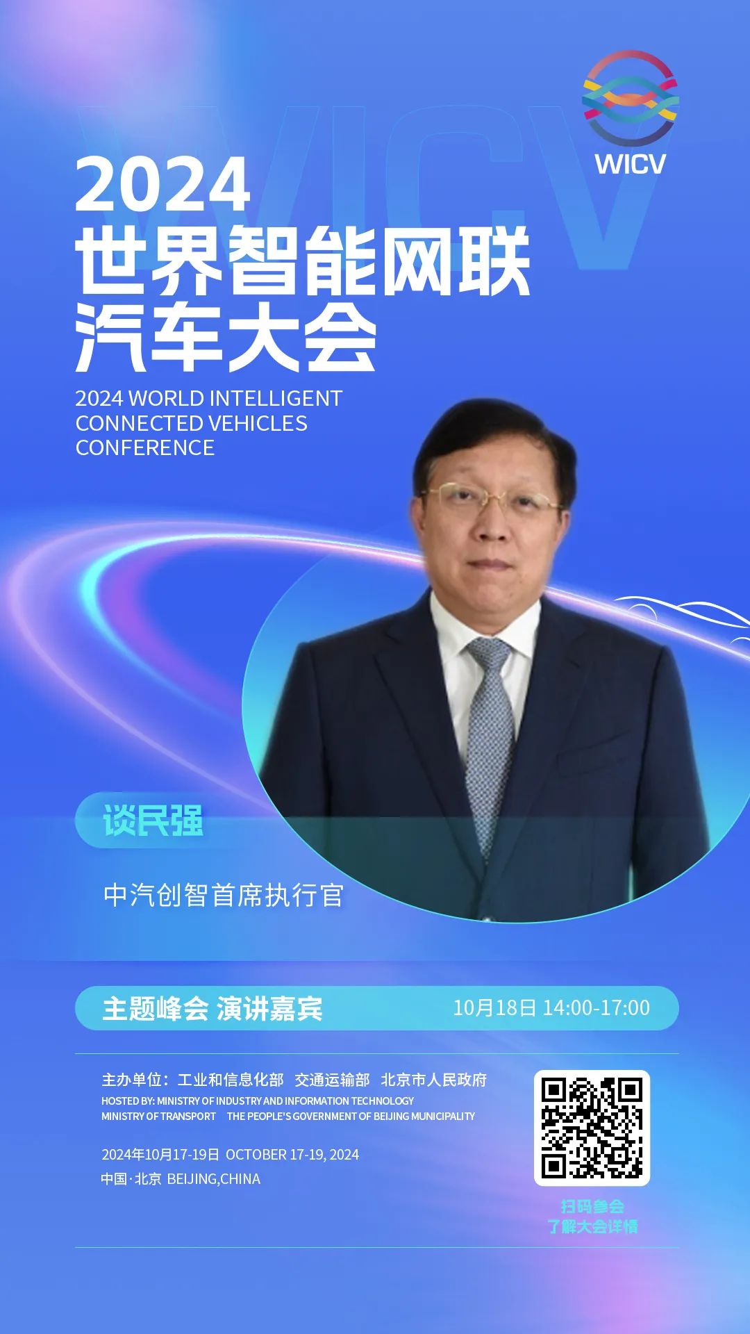 世界智能网联汽车大会(英文简称WICV)是我国首个经国务院批准的国家级智能网联汽车专业会议,自2018年起,已连续成功举办六届。2024世界智能网联汽车大会由工业和信息化部、交通运输部、北京市人民政府共同主办,将于10月17-19日在北京召开。