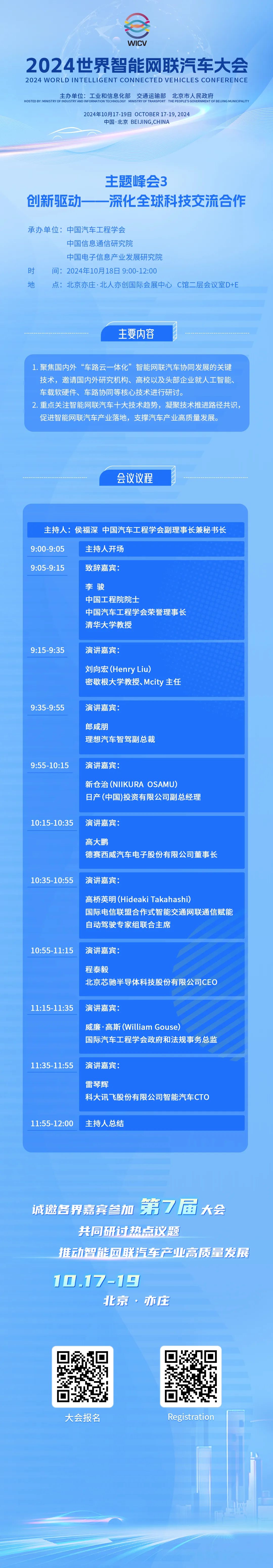 世界智能网联汽车大会(英文简称WICV)是我国首个经国务院批准的国家级智能网联汽车专业会议,自2018年起,已连续成功举办六届。2024世界智能网联汽车大会由工业和信息化部、交通运输部、北京市人民政府共同主办,将于10月17-19日在北京召开。