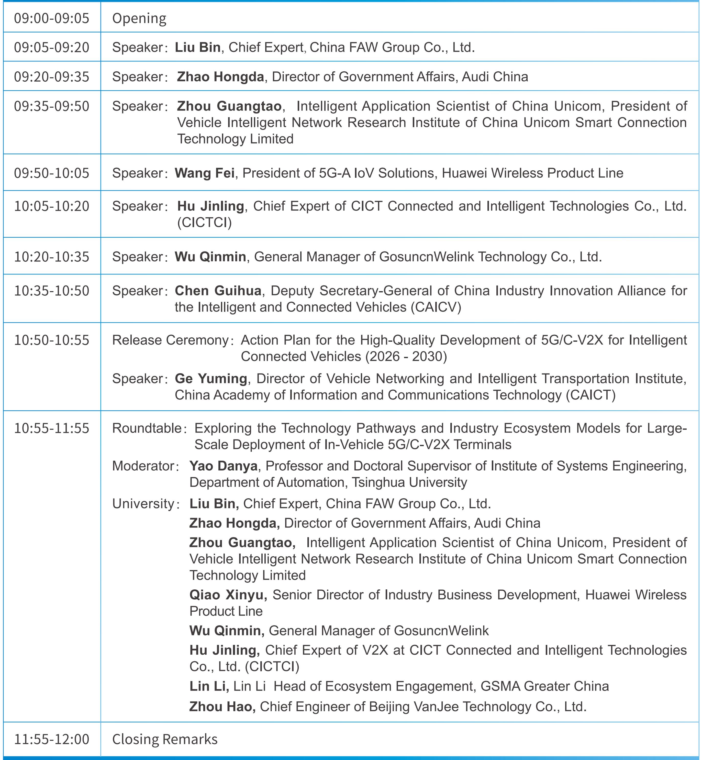 Main Content: Structured around three core focal points—creating high-value connected applications for 5G/C-V2X, promoting cross-domain technological integration, and pioneering innovative industry ecosystem models—this event will examine the practical application of 5G/C-V2X in critical scenarios. These include cooperative alerts, cooperative assisted driving, cooperative autonomous driving, smart cockpits, remote driving, and in-vehicle AI. The discussion will also address key barriers to the mass production of OEM-installed onboard units, with the goal of advancing the real-world deployment and integrated application of these advanced use cases.