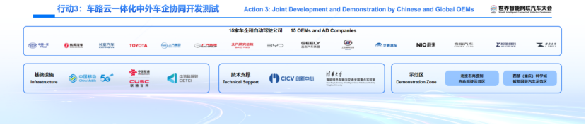 行动三:车路云一体化中外车企协同开发测试。国家智能网联汽车创新中心和清华大学,组织联合一汽、东风、长安、丰田、比亚迪、吉利等15家中外车企和自动驾驶企业,在中国移动、中国联通、中信科智联等企业支持下,在北京和重庆两个试点城市开展协同开发测试,统一技术路径,加快“车路云一体化”功能量产上车。
